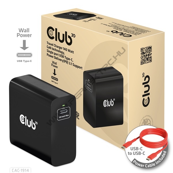 • CAC-1914 Utazó Töltő 140 Watt GaN technológiával, egyetlen port USB Type-C, Power Delivery(PD) 3.1 támogatás - hálózati csatlakozó (specifikálás megrendeléskor)