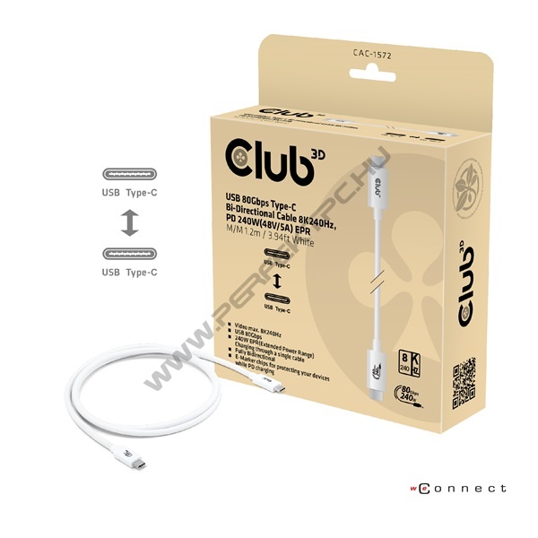 Club 3D Kábel - CAC-1572 (USB4 USB-C, 240W PD, 80Gbps, 8K240Hz, 4K540Hz, Bidirectional, fehér, M/M, 1,2m)
