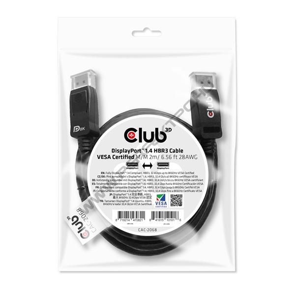 A Club 3D CAC-2068 DisplayPort™ 1.4 HBR3 VESA tanúsítvánnyal rendelkező kábel lehetővé teszi a DisplayPort™ támogatott (Gaming) PC vagy Laptop csatlakoztatását egy (Ultra) Nagy Felbontású Monitorhoz vagy más DisplayPort™ támogatott eszközhöz 8K60Hz-es felbontásig. A DisplayPort™ 1.4 támogatja a Display Stream Compression 1.2 (DSC) technológiát, a Hiba Javítást (FEC), és a maximális sorba kapcsolt audio csatornák számát 32-re növeli. Zárható DisplayPort™ csatlakozókkal rendelkezik, amelyek biztosítják a biztonságos, megbízható kapcsolatot. Egyszerűen nyomja meg a beépített egyérintéses rögzítőgombot a csatlakozó kioldásához. A puha UltraFlex burkolat megvédi a kábelt a hajlításoktól és a deformációs károktól.