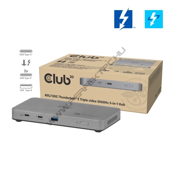 Club 3D Notebook Dokkoló - CSV-2563 (180W,Thunderbolt 5 to 3xUSB-C, USB-A, 1x 8K60Hz, 3x 5K60Hz)