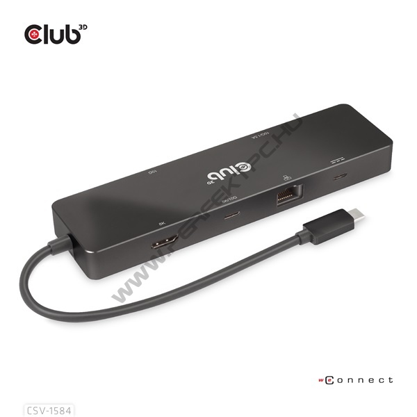 A Club 3D CSV-1584 egy USB3.2 Gen2 Type-C, 6 az 1-ben elosztó HDMI™ 8K30Hz/4K60Hz, 2xUSB Type-A(10G), Ethernet RJ45 (1Gbps) és 2xUSB Type-C, 1x Video4K60Hz) vagy 0 adatátvitellel (x10GG) vagy 0.0. watt, amely ideális megoldást kínál az USB Type-C port vagy a Thunderbolt gazdagép (PC/Laptop/Mobiltelefon stb.) bővítésére, különösen az egyetlen USB Type-C porttal rendelkező gépek számára. Ez a hub DP1.4 Alt móddal támogatott IC-t alkalmaz, amely lehetővé teszi legfeljebb egyetlen 8K30Hz-es (DSC) vagy két különböző videó (2-szer 4K60Hz) kimenetét, az USB Type-C Videoport pedig támogatja az USB3.2 Gen2 adatok átvitelét is maximum 10 Gbps sebességgel. 2 USB Type-A és USB Type-C Video port lehetővé teszi 3 USB-eszköz egyidejű csatlakoztatását. A Gigabit Ethernet port lehetővé teszi az internetezést, az USB Type-C PD töltőport pedig maximum 100 W PD töltést támogat. Minden DP Alt móddal támogatott USB Type-C gazdagépen működik.
