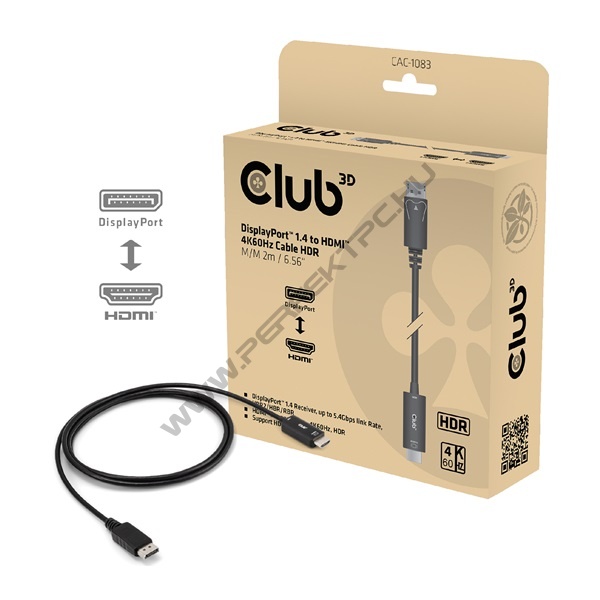 A Club 3D CAC-1083 egy DisplayPort™ 1.4-HDMI™ 4K60Hz-es kábel HDR M/M 2m / 6.56ft konverterrel. Támogatja a HDR Video minőségű mély színes médiatartalmak lejátszását. A DisplayPort™ vevő sávonként akár 5,4 Gbps-t támogat 4 sávon keresztül. A HDMI™ kimenet teljes mértékben megfelel a HDMI™ specifikációnak.