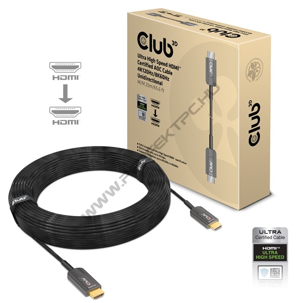A Club 3D CAC-1379 Ultra High Speed HDMI™ tanúsítvánnyal rendelkező Aktív Optikai Kábel lehetővé teszi akár 20 méteres / 65,6 lábas távolságban a kedvenc kijelzőhöz való csatlakozást. Az Ultra High Speed HDMI™ 2.1 sávszélessége 48Gbps-ra növekedett, támogatva a 4K 120Hz vagy 8K60Hz felbontásokat. Az új specifikáció részét képezi a Display Stream Compression (DSC) 1.2, amely a 8K-nál magasabb videó formátumokhoz szükséges. Továbbfejlesztett képfrissítési funkciók: változó képfrissítési ráta (VRR), Quick Media Switching (QMS) és Quick Frame Transport (QFT). Statikus és dinamikus HDR10 metaadatok támogatása is elérhető.