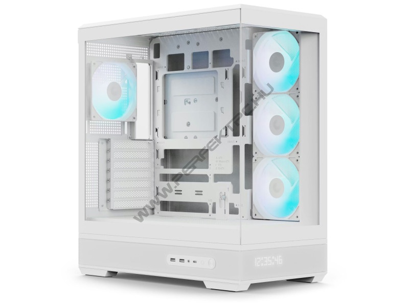 Az Aerocool P500B Digi PC ház fantasztikus választás egy nagy teljesítményű gamer PC vagy munkaállomás építéséhez. Ez a ház kiváló támogatást nyújt a legújabb gamer hardverekhez, beleértve a modern hátlapi csatlakozós ATX alaplapokat és egy erőteljes grafikus kártyát az NVIDIA RTX 50 vagy AMD Radeon 9000 sorozatból. Az ezzel a házzal épített PC stílusos megjelenéssel büszkélkedhet, az elülső és oldalsó edzett üveg panelek pedig hihetetlen panoráma kilátást nyújtanak a belső térbe. Ráadásul a P500B Digi egy dot-pixel LED kijelzővel van felszerelve a ház elején, amely valós idejű rendszerinformációk megjelenítésére használható retró esztétikával. Középméretű PC ház Kompatibilis a hátlapi csatlakozós ATX alaplapokkal Hét PCIe foglalat és 425 mm-es GPU-hézag a modern grafikus kártyák támogatásához Akár tíz darab 120 mm-es ventilátort és egy 360 mm-es radiátort is képes befogadni Dupla edzett üveg panelek panoráma kilátást nyújtanak a házba Stílusos dot-pixel kijelző az előlapon valós idejű rendszerinformációkhoz Széles körű kompatibilitás modern hardverekkel Az Aerocool P500B Digi PC ház tökéletes egy modern gamer PC vagy kreatív munkaállomás építéséhez. Ez a ház tágas főkamrával rendelkezik, amely könnyedén támogat egy modern ATX alaplapot, beleértve a hátlapi csatlakozós ASUS BTF és MSI Project Zero modelleket. Hét PCIe foglalattal és 425 mm-es GPU-hézaggal a P500B Digi még a legnagyobb, legerősebb grafikus kártyákat is befogadja, mint például egy NVIDIA GeForce RTX 5090. A főkamra alatti tápegység-üregben 260 mm szabad hely van egy nagy teljesítményű tápegység számára. Ez bőséges helyet biztosít egy csúcskategóriás ATX tápegységnek, miközben rengeteg tér marad a kábelmenedzsmenthez. Stílusos megjelenés a monitorozás támogatásával Az Aerocool P500B Digi PC házzal épített gép egyedi esztétikával rendelkezik, amely egyszerre stílusos és funkcionális. Az elülső és oldalsó dupla edzett üveg panelek 270 fokos kilátást nyújtanak a ház belsejébe, hogy megmutasd gamer hardvereidet és építési készségeidet. Ezek mellett a P500B Digi egy stílusos, mégis funkcionális dot-pixel LED kijelzővel rendelkezik az előlap alján. Ez a panel a klasszikus dot mátrix kijelzők retró esztétikáját idézi, és számos kimenet megjelenítésére használható. Ez a képernyő használható az aktuális idő vagy valós idejű rendszeradatok, például CPU-hőmérséklet vagy GPU-kihasználtság megjelenítésére. Erőteljes hűtési támogatás Az Aerocool P500B Digi PC házzal könnyedén optimális hőmérsékleten tarthatod a gamer hardvereidet. Ez a ház több ventilátor támogatást kínál, a felső, oldalsó és tápegység-burkolat részen egyenként három 120 mm-es ventilátor helyezhető el, míg a hátsó panelen egyetlen ventilátornak van hely. Így ez a ház akár tíz ventilátort is befogadhat! Ráadásul két helyen lehet radiátort felszerelni ebben a házban. A felső panel bármilyen, 120 mm-től 360 mm-ig terjedő radiátort befogad, míg az oldalsó panel 120 mm-es, 240 mm-es vagy 360 mm-es radiátort támogat. Műszaki adatok Alaplap támogatás Maximális alaplap formátum: ATX Kompatibilis alaplap formátumok: ATX, Micro-ATX, Mini-ITX Hátlapi csatlakozás: igen Ház típusa Ház típus: Mid Tower Ventilátor támogatás Maximális ventilátorszám: 10 120 mm-es ventilátorok: 10 140 mm-es ventilátorok: 2 Előre szerelt ventilátorok: 3× 120 mm Radiátor támogatás Maximális radiátor kompatibilitás: 360 mm Színek Alapszín: fehér Méretek Hossz / mélység: 460 mm Szélesség: 235 mm Magasság: 500 mm Belső térfogat: 51 liter Bővítőhelyek Bővítőhelyek / PCI-helyek: 7 Ház jellemzői I/O pozíció: oldal Oldalsó panel: ablakkal (edzett üveg) Függőleges GPU-tartó: nem Előlapi ajtó: nem Kábelmenedzsment: igen Szűrők mellékelve: igen Zajcsillapítás: nem Tápegység Tápegység mellékelve: nem Tápegység formátum: ATX Tápegység pozíciója: hátsó alsó rész Belső méretek Maximális CPU hűtő magasság: 170 mm Maximális GPU-hossz: 425 mm Maximális tápegység hossza / mélysége: 260 mm Meghajtóhelyek Maximális 2,5 hüvelykes meghajtók: 3 Maximális 3,5 hüvelykes meghajtók: 2 Maximális 5,25 hüvelykes meghajtók: 0 Hot-swap meghajtórekeszek: nem Kijelző Kijelző mellékelve: nem Külső portok USB 3.2 (külső) Type-C: 1 USB 3.0 (külső) Type-A: 2 Audio kimenetek és bemenetek: 1× kombinált kimenet / bemenet (3,5 mm-es jack, 4 tűs, TRRS) Kártyaolvasó: nem Világítás Világítás / RGB: igen RGB vezérlő: igen RGB típus: RGB Ventilátor fejléc Ventilátor vezérlő / ventilátor hub: nem Kábel specifikációk Hosszabbító kábel mellékelve: nem