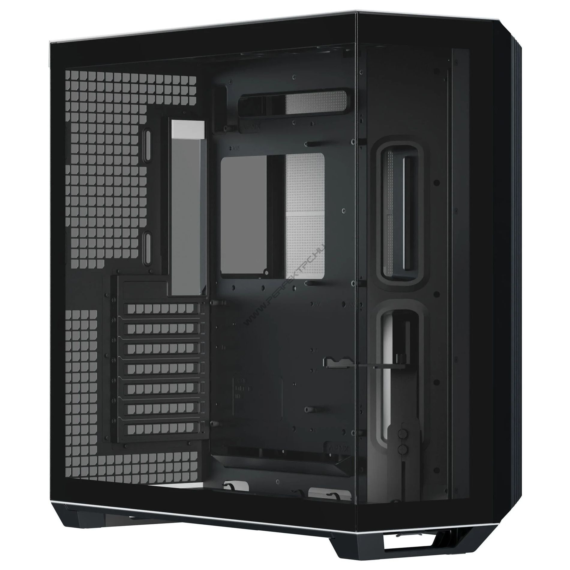 Az APNX V1 Midi-Tower nemcsak erős teljesítményt, hanem lenyűgöző megjelenést is biztosít. Ez a ház ötvözi a kifinomult hűtési lehetőségeket és a rugalmas kialakítást egy olyan megjelenéssel. Tökéletes azok számára, akik stílusos összeállítást szeretnének, amely nemcsak erőteljes, hanem esztétikus is. • Stílusos miditorony edzett üveg oldalpanellel • Elegáns kialakítás diófa előlappal • Kompatibilis az ATX, Micro-ATX és Mini-ITX alaplapokkal • Alkalmas nagy, akár 220 mm hosszú ATX tápegységekhez • Meghajtó helyek: akár 6x 2,5 hüvelykes SSD vagy 2x 3,5 hüvelykes HDD és 4 x 2,5 hüvelykes SSD • Hely az akár 395 mm hosszú, nagy teljesítményű GPU-k számára • I/O panel 1x USB-C, 2x USB 3.2 és audio jack csatlakozóval • Rugalmas hűtés: akár 10 ventilátor vagy radiátor 360 mm-ig APNX V1 számítógépház: Tökéletes hűtés az innovatív kialakításnak köszönhetően Az APNX V1 kétkamrás kialakítása 45 fokos szögben elhelyezett speciális levegőbeömlővel rendelkezik, amely maximalizálja a GPU és a CPU hűtési teljesítményét. A nagy építményekhez tervezett ház akár 395 mm hosszú grafikus kártyák és akár 170 mm magas CPU-hűtők számára is helyet biztosít. Akár tíz ventilátor is felszerelhető, így a légáramlást kívánsága szerint tervezheti meg. Legyen szó levegő- vagy vízhűtésről - a V1 különböző radiátorméreteket támogat: felül, elöl és alul 360 mm-ig, hátul pedig 120 mm-ig. Egyszerű telepítés - szerszám nélkül és gyorsan A V1 házban a számítógép telepítése és karbantartása gyerekjáték. A szerszám nélküli gyorskioldó rögzítőknek köszönhetően az elülső, oldalsó és felső részek csavarok nélkül oldhatók. A ventilátorkonzolokon található praktikus gyorskioldó rögzítők biztosítják, hogy a ventilátorok vagy radiátorok felszerelése zökkenőmentesen történjen. A karbantartás is gyerekjáték: az APNX V1 Midi-Tower könnyen eltávolítható szűrőkkel rendelkezik minden fontos helyen. Optimalizált kábelrendező a kevésbé látható kábelekhez A jól átgondolt kábelrendező rendszer tépőzáras hevederekkel és gumitömítésekkel biztosítja a rendezett belső teret. Az integrált konzol támogatja a grafikus kártyát is - ideális a nehéz GPU-khoz. Ez mindent stabilan és rendezetten tart anélkül, hogy kábelek akadályoznák vagy befolyásolnák a légáramlást. Az alaplap rugalmas elhelyezése és testreszabási lehetőségek Az APNX V1 kétféle alaplapi telepítési lehetőséget kínál, ezzel javíthatja a GPU légáramlását, vagy helyet biztosíthat a nagyobb radiátorok és ventilátorok számára. Ez rugalmasságot biztosít, és lehetővé teszi, hogy a számítógép felépítését pontosan az Ön igényeinek megfelelően tervezze meg. Rengeteg hely az APNX V1-ben a vízhűtés és a ventilátorok számára Az APNX V1-ben rugalmas radiátorszerelési lehetőségeket talál: elöl és felül 360 mm-ig, alul 360 mm-ig (csak az alaplap felső részén 140 / 280 mm) és hátul 120 mm-es radiátor lehetséges. Léghűtés esetén a V1 akár három 120 mm-es vagy két 140 vagy 160 mm-es ventilátort is képes befogadni elöl, három 120 mm-es vagy két 140 mm-es ventilátort felül, valamint legfeljebb három 120 mm-es vagy két 140 mm-es ventilátort alul és egy 120 mm-es ventilátort hátul. Ezek az opciók garantálják az optimális légáramlást - függetlenül attól, hogy milyen melegek az alkatrészek. Midi-torony sokoldalú tárolási és csatlakoztatási lehetőségekkel A tárolásról is gondoskodunk: Az APNX V1 számítógépház akár hat 2,5 hüvelykes meghajtót vagy két 3,5 hüvelykes és négy 2,5 hüvelykes meghajtó kombinációját is támogatja. A ház tetején egy jól megtervezett I/O panel található USB-C porttal, két USB 3.2 porttal és külön audio bemenettel - tökéletes a gyors csatlakozáshoz és a zökkenőmentes működéshez. Műszaki adatok Méretek / méretek Hossz / mélység: 500 mm Szélesség: 290 mm Magasság: 485,5 mm Ház típusa: Midi-torony Alaplap támogatás Kompatibilis alaplapformátumok: ATX, Micro-ATX, Mini-ITX Max. alaplap méret: ATX Belső méretek max. CPU-hűtő magassága: 170 mm Grafikus kártya max. hossza: 395 mm max. tápegység hossza / mélysége: 220 mm Tápegység Tápegység mellékelve: Nem Tápegység formátuma: ATX Tápegység helyzete: belső Ventilátor támogatás Ventilátor 120 mm: 10 Ventilátor 140 mm: 6 Ventilátor 160 mm: 2 Ventilátor előre telepítve: 0 Radiátor támogatás Max. radiátor kompatibilitás: 360 Meghajtó-beépítőhelyek 2,5 hüvelykes belső: 4 3,5 hüvelykes belső: 2 Külső kapcsolatok USB4 Gen 2x2 (külső) C típus: 1 USB 3.0 (külső) A típus: 2 Kártyaolvasó: Nem Bővítő / PCI bővítőhelyek 7