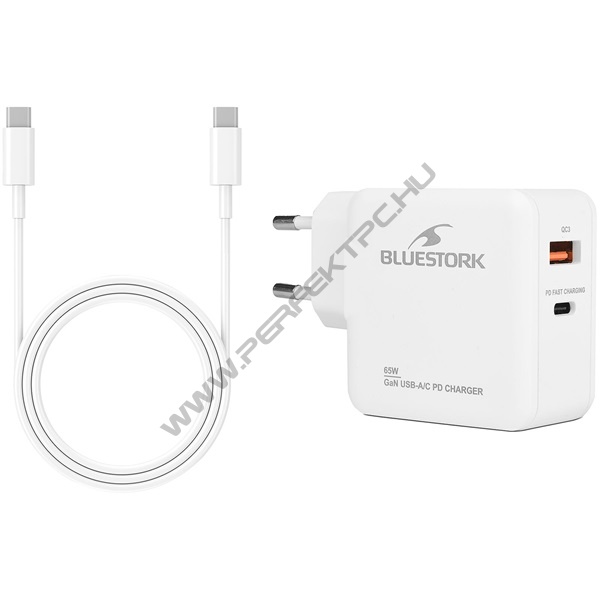 Bluestork Hálózati töltő - PW-BS-65-GAN-C-A-W (USB-C, USB-A, 65W, 1,8m kábel, gyorstöltés, fehér)