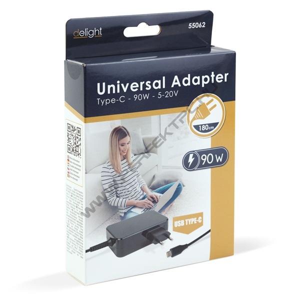 Delight Type-C (USB-C) adapter 90W (55062), DC 5-20V, 1,8 m - fekete